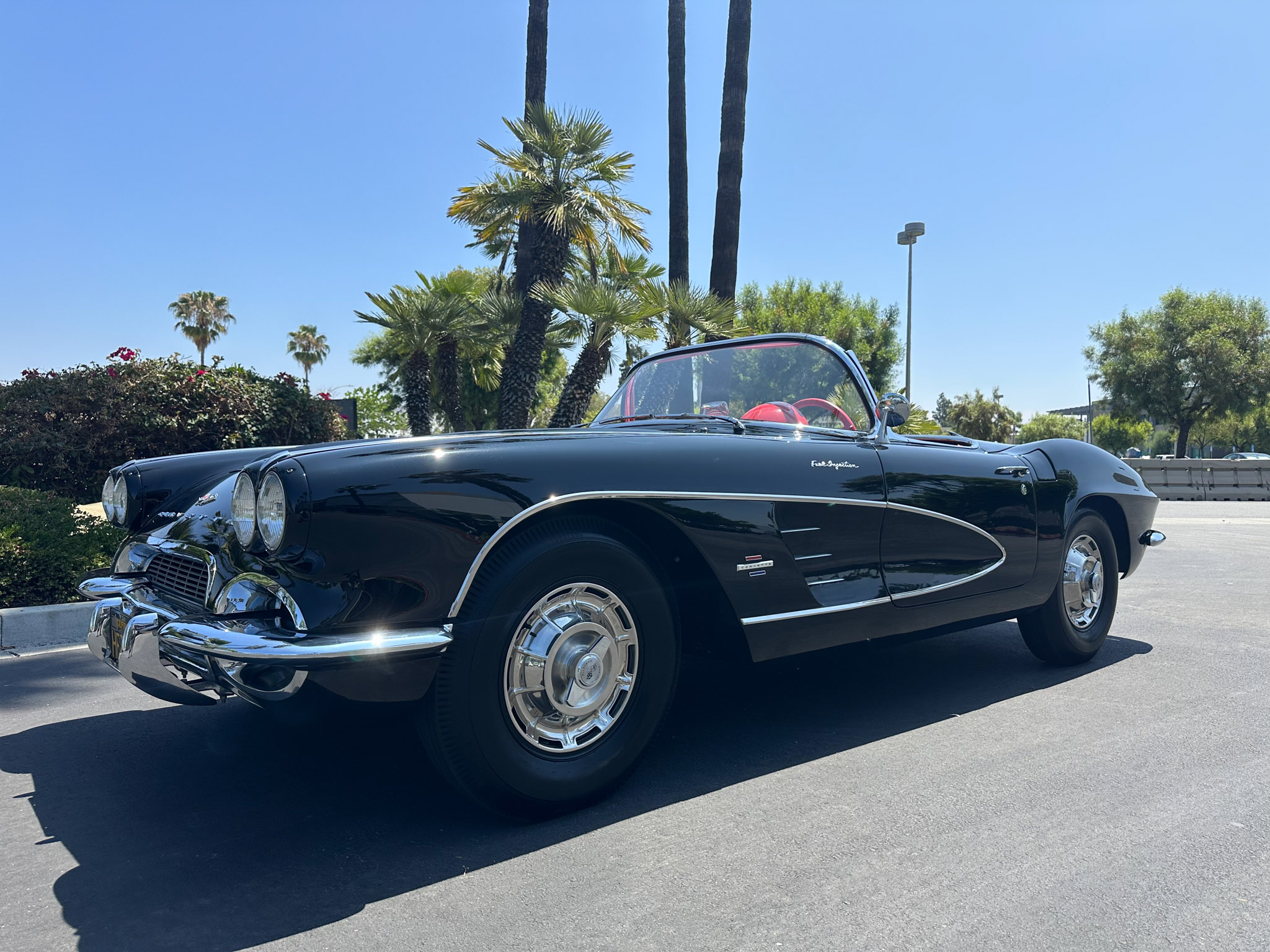 Tuxedo Black w/Red interior, 283/315hp, 4-Speed Manual Transmission 1961 was a turning point in Corvette history — the final year of the legendary 283ci engine, and it went out with a bang! Chevrolet offered five variations that year, from the mild-mannered 250hp single-quad to the fire-breathing, fuel-injected 315hp solid-lifter V8. And if you were hunting for the baddest, most exotic Corvette on the showroom floor, this was the one that made hearts race and wallets open! The example offered here is nothing short of breathtaking. Finished in the ultra-desirable Tuxedo Black with Red interior, it’s undergone a no-expense-spared, frame-off restoration that leaves nothing to be desired. Under the hood, its numbers-matching, fuel-injected 283/315hp engine delivers the raw, high-revving punch that defined America’s sports car in its purest form — all funneled through a crisp 4-speed manual transmission. Both hard and soft tops accompany the car, adding versatility and style. Its excellence in authenticity and condition has been recognized with the coveted NCRS Top Flight Award — proof that this Corvette isn’t just beautiful, it’s the real deal. A rare combination of style, performance, and pedigree — this ’61 Corvette embodies the golden era of American performance. Bold. Beautiful. Black. And absolutely unforgettable.