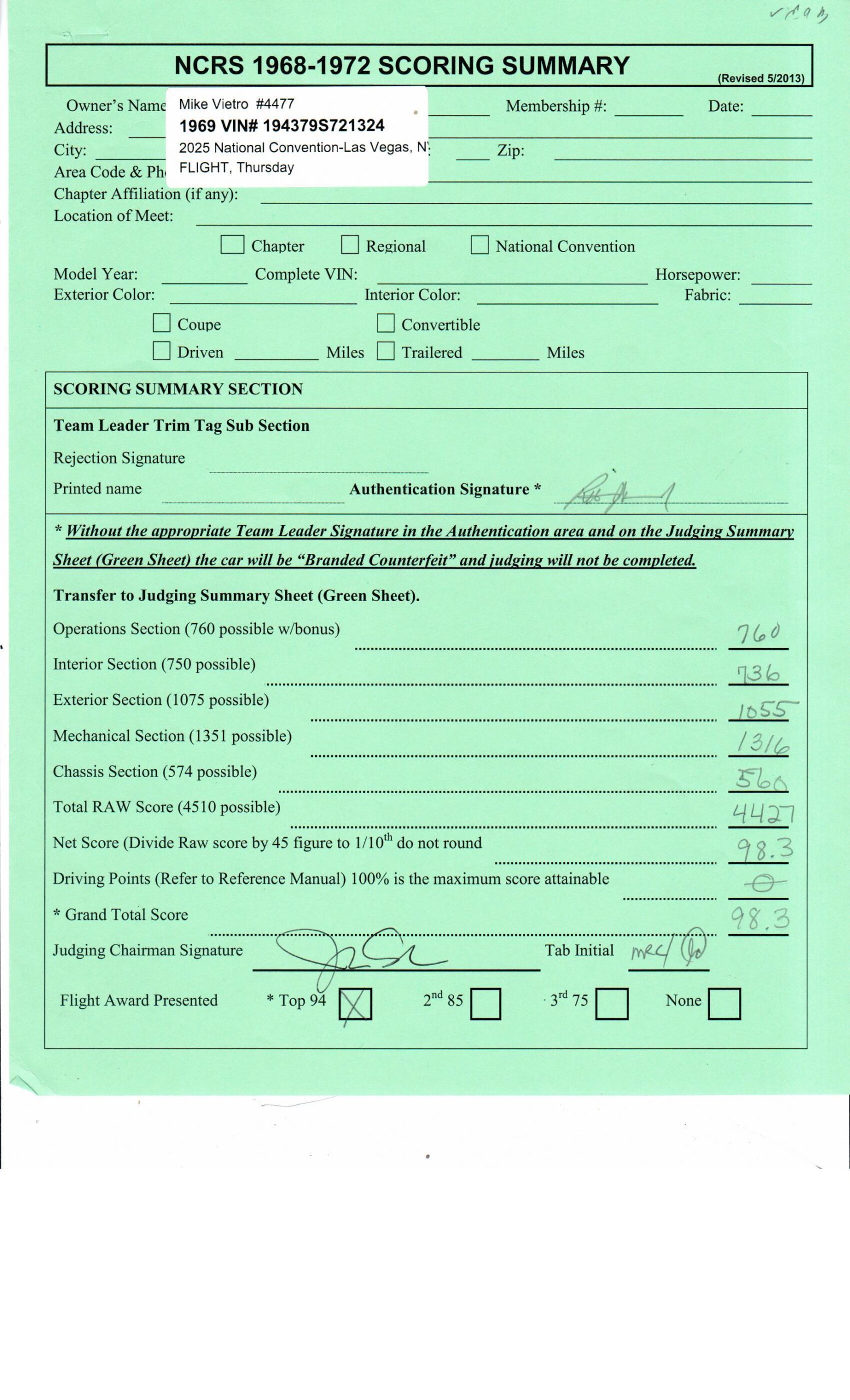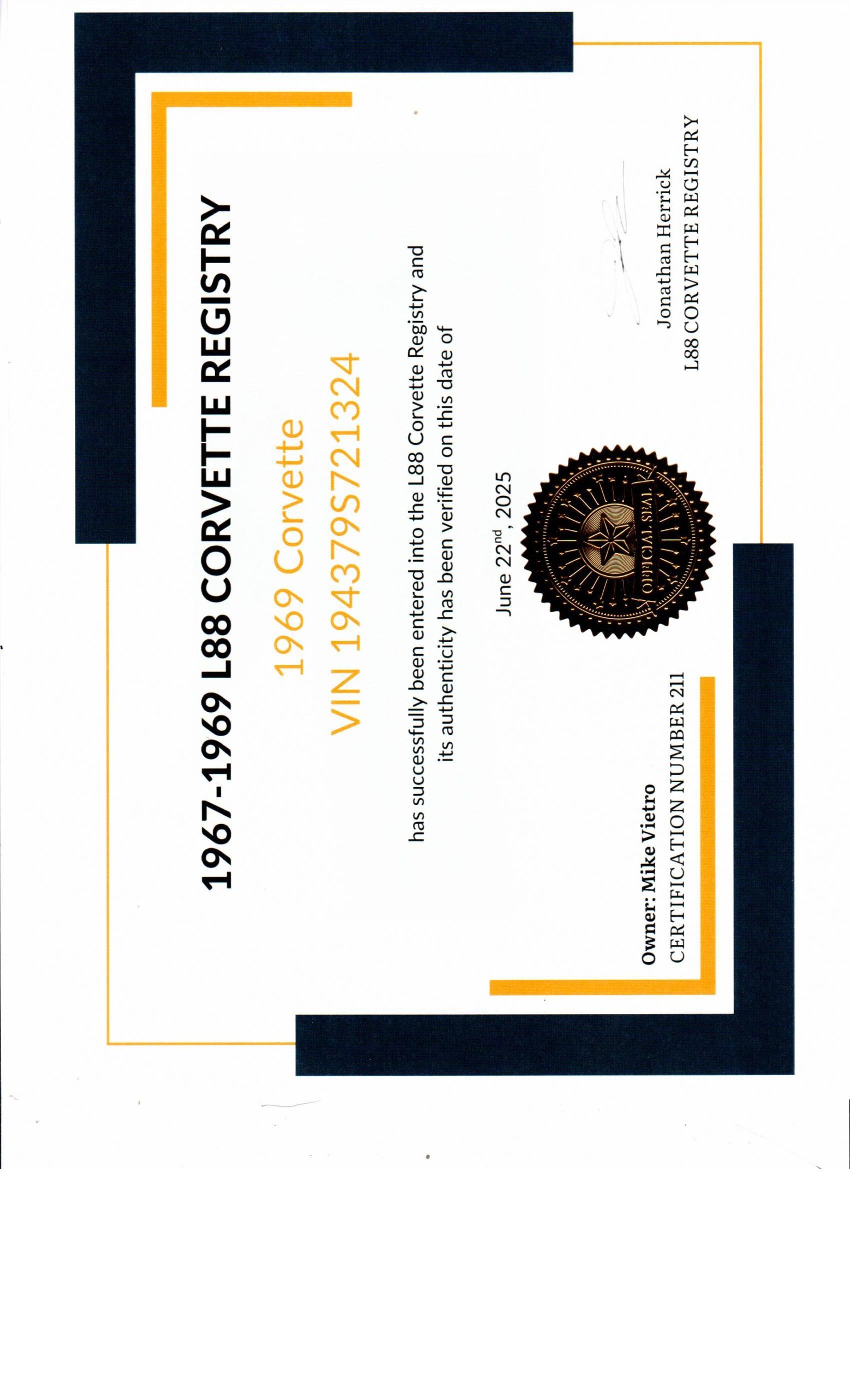 Riverside Gold w/Black interior, L88 427/500+hp, 3-speed automatic transmission. The legend. The myth. The mighty L88! Seldom seen but always heard! Riverside Gold 1969 L88 Corvette Automatic Coupe Makes History at 2025 NCRS National Convention The Corvette world is abuzz about a legendary Riverside Gold 1969 L88 Corvette automatic coupe that stole the spotlight at the NCRS Nationals meet in Las Vegas. Scoring 98+/100, this super rare and iconic Corvette has just achieved a stunning milestone, the most recent 98+ score for an L88 with its original engine at a national NCRS event. Thisremarkable car has cemented its place in Corvette history. The journey of this exceptional vehicle traces back to June 1986, when it was showcased in the prestigious Bloomington Gold Special Collection under the stewardship of noted enthusiast Ed Mueller. Later, the car joined a world-class private collection in New York and Beverly Hills featuring twelve big-block Corvettes, including four L88s. Thanks to Corvette Mike Vietro and the support of a trusted colleague, the entire collection was preserved, securing the legacy of some of the most significant Corvettes ever assembled. In December 1996, this L88 Corvette began a new chapter under the auspices of marque maven Mike Vietro. In northern California for nearly thirty years, it stood out as the singular Corvette in a prominent muscle car collection. Earlier this year, the car was lovingly restored at Mike’s Anaheim, California facility, specifically for NCRS judging, returning this golden legend to the national stage and further illuminating its story. With its factory rating of 430 hp—but delivering an actual 550 hp on race fuel—this L88 Corvette, affectionately known as “Goldie,” captures the true spirit of the American go-fast mentality. The car’s unmatched originality includes its original engine, automatic transmission, side pipes, and black leather interior, all augmented by a comprehensive trove of factory documentation—even the original buyer’s deposit receipt from December 1968. As a mere 17 L88s Corvettes were ever produced with an automatic transmission, the Riverside Gold L88’s combination of authenticity, performance, and provenance makes it a crown jewel among the rolling gems in the hobby. With its recent NCRS triumph, this uniquely optioned Corvette stands proudly as a shining example of America’s ultimate big-block sports car.